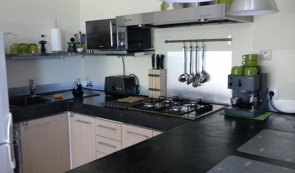 The kitchen is located at the back of the living room. It is a practical kitchen with all the necessary dishes, cutlery, and tools. There is a microwave, and most essential items for daily use. For brewing a cup of coffee, there is a small espresso maker and a Nespresso machine for capsules.