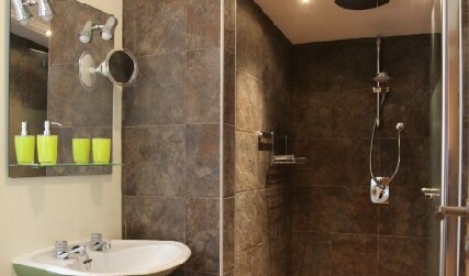 The bathroom is furnished with a toilet, bidet, sink, and a large walk-in shower with both a standard shower and a rain shower. It is located directly opposite the bedroom. There is also a window on the exterior wall and a shelf for toiletries. A hairdryer is standardly available.