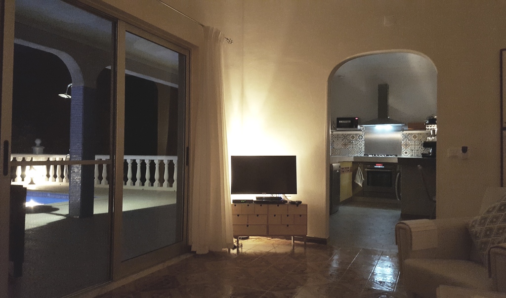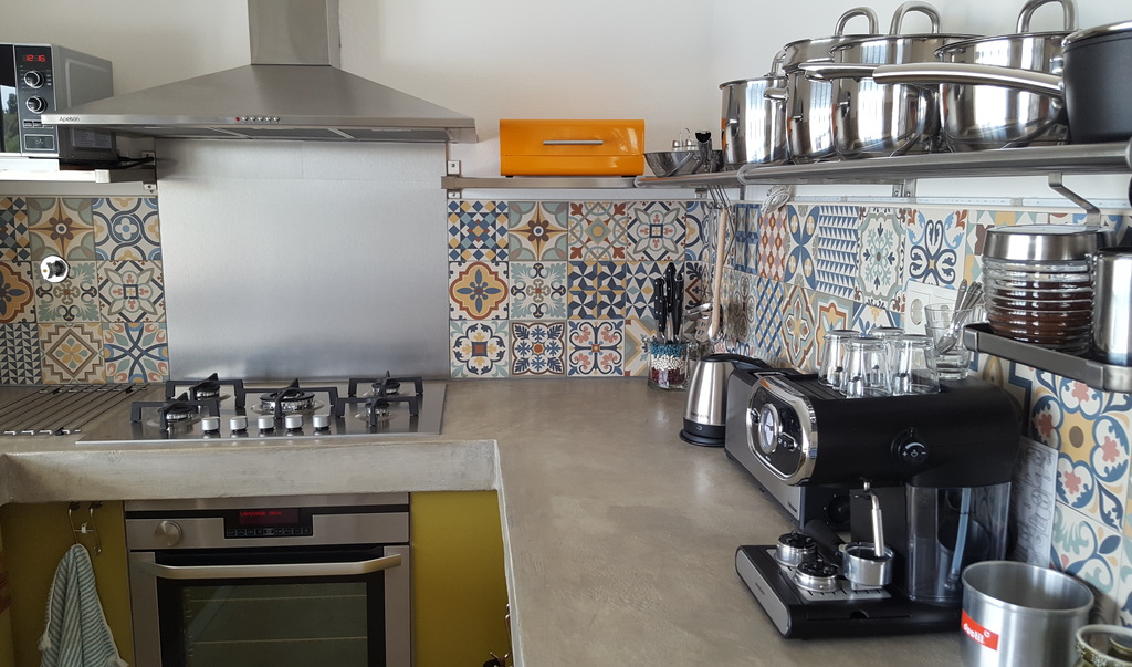 You have access to a living room of 6x6 meters, with traditional tiles on the floor that face south. There is ample seating, with a large (sliding) window, a screen door, and access to the south-facing terrace and view of the pool. A strong ceiling fan provides any necessary cooling. There is WiFi and satellite TV with many Dutch and foreign channels.